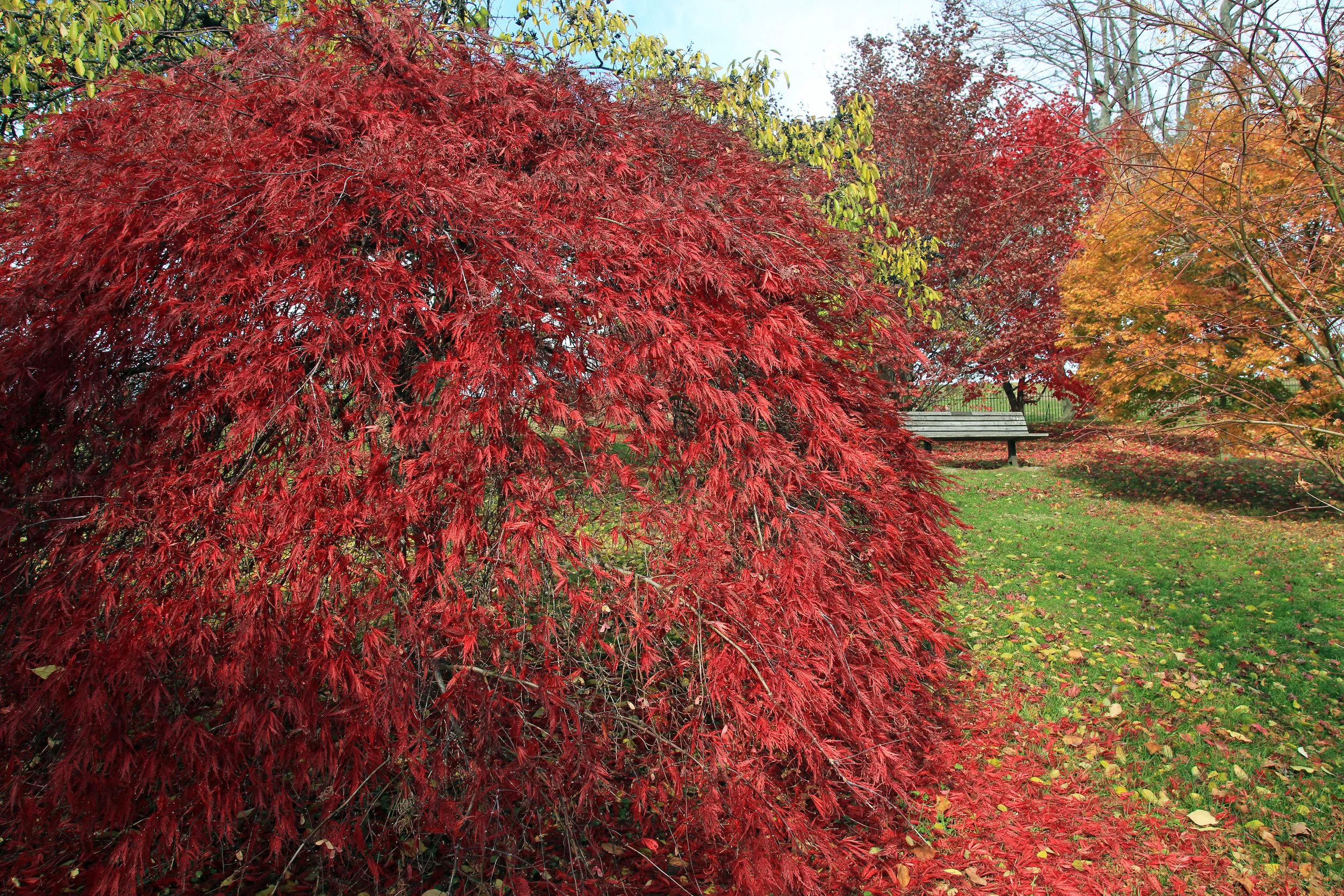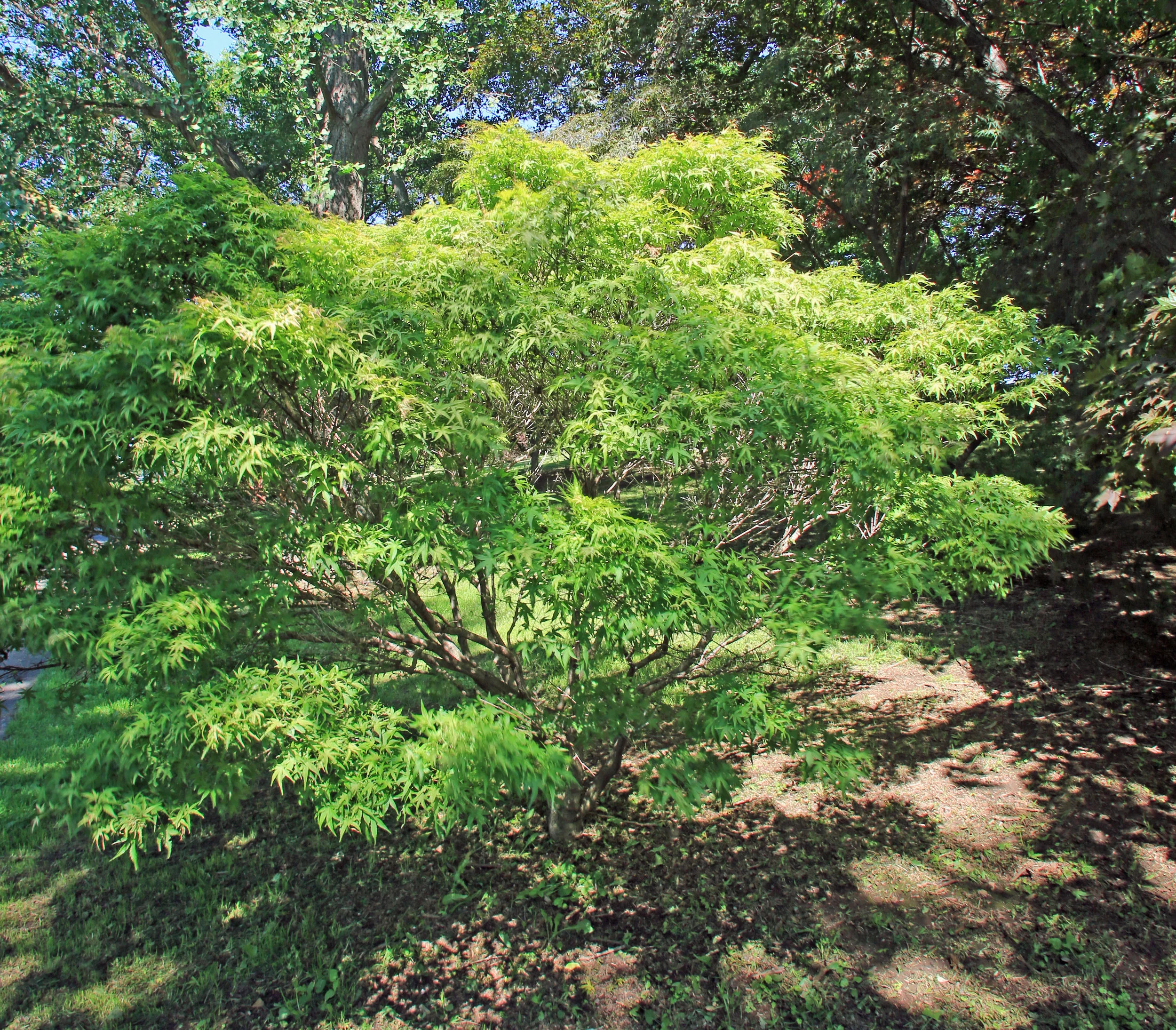 A collection of Japanese maples, located on the south-facing slope below the reservoir, were planted for their ornamental effects. Highland's collection varies in growth habit from upright to weeping forms, in color from green to red or purple, and in texture from broad fan-shaped leaves to deeply cut fern-like foliage.